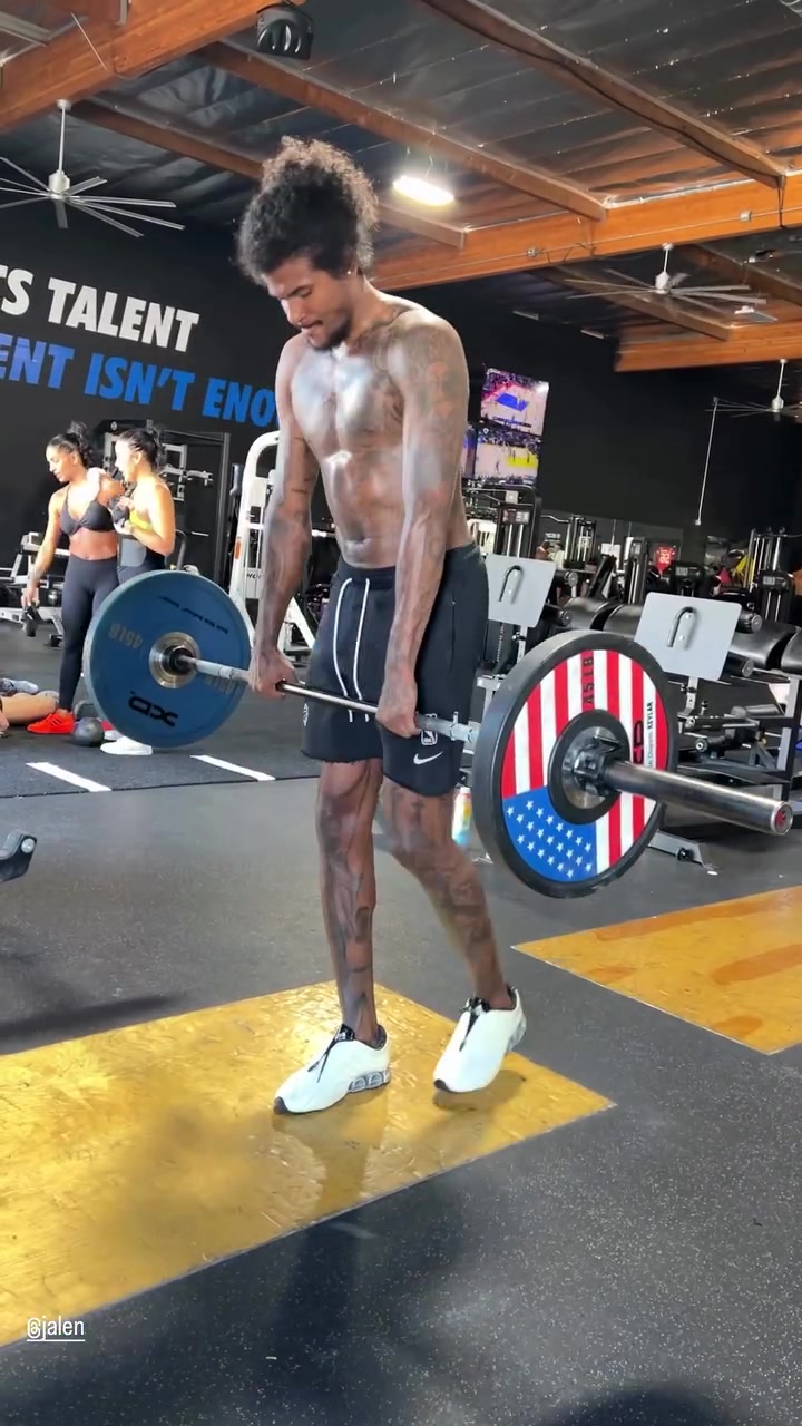 画面中,杰伦-格林单脚支撑如“金鸡独立”,双手稳稳提举杠铃,展现出极强的力量与平衡能力。